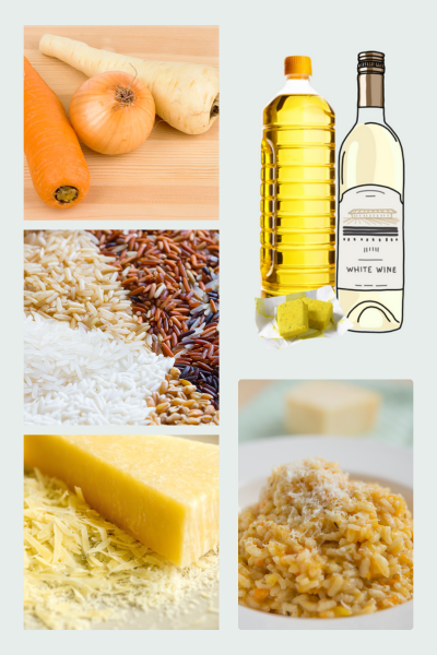 Fräs lök, vitlök och övriga grönsaker i olja, tills löken blir mjuk och lite glansig, fräset ska inte ta färg. Häll i riset och fräs med ett par minuter utan att det bränner vid, rör om regelbundet. Använder du vin börjar du med att tillsätta detta. När vinet kokat in börjar du tillsätta buljongen lite i taget, vätskan ska vara i nivå med riset när lagom mängd tillsatts. Rör om regelbundet. När risotton känns färdig med härligt krämig konsistens med lite tuggmotstånd kvar i riset – smaka av, salta och peppra och rör ner riven ost.